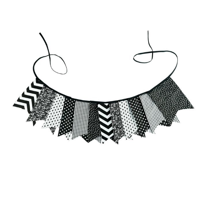Гирлянда состоит из 12 флажков, общая длина составляет 3,4 м, расстояние между флажками 3 см, длина матерчатых флажков 2,1 м, длина лямок с обеих сторон по 50 см