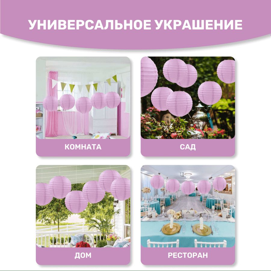 В комплект входит 8 бумажных фонариков и лента атласная.