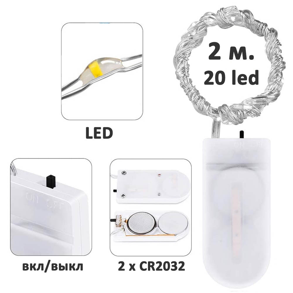 Серебристый цвет провода, 2 метра, 20 диодов